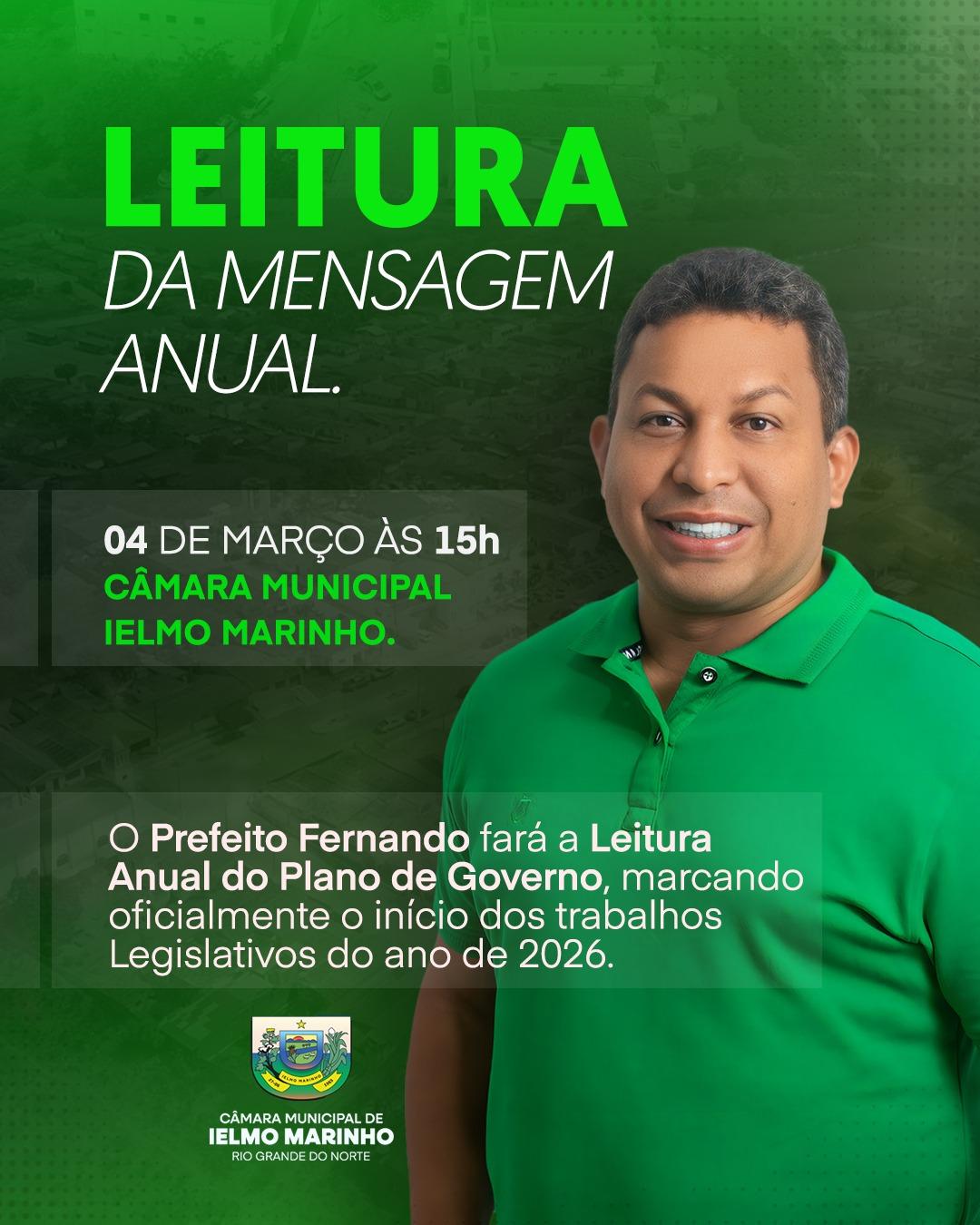 No próximo dia 4 de março, às 15h, no Plenário da Câmara Municipal de Ielmo Marinho, acontece a Leitura da Mensagem Anual do Prefeito Fernando, marcando oficialmente o início dos trabalhos legislativos do ano de 2026.